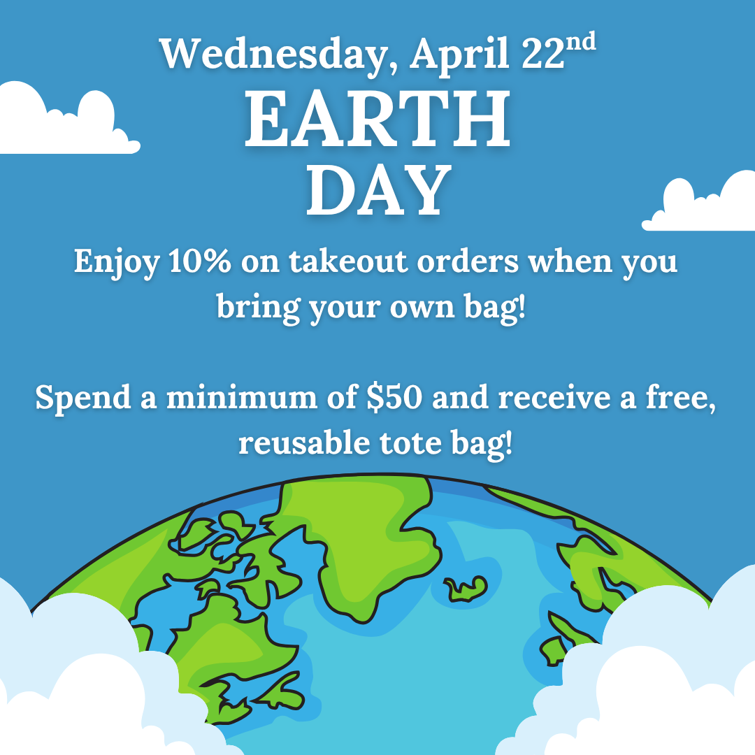 Celebrate Earth Day with us! Bring your own bag and get 10% off your takeout order. Spend $50 or more and take home a free reusable tote on us.