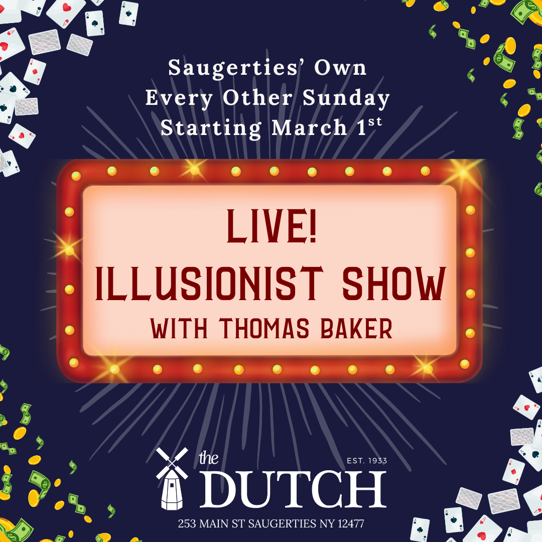 Starting March 1st, Saugerties’ own illusionist Thomas Baker will be joining us every other Sunday beginning at 1PM for live, walk-around magic.